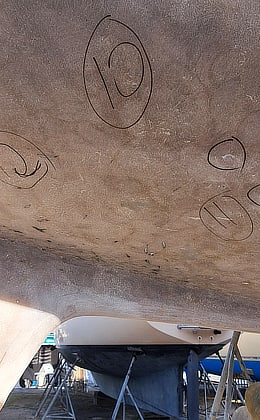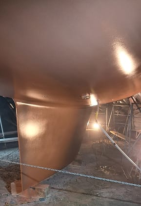 The other project was replacing our “Coppercoat” antifoul. Because “Cow” wanted to check that we had no osmosis we had the whole of the bottom stripped and, I am delighted to say, all was fine. Apparently, moisture readings of over 15 are a concern but having gone round the whole boat he was noting mainly 9’s to 11’s.
