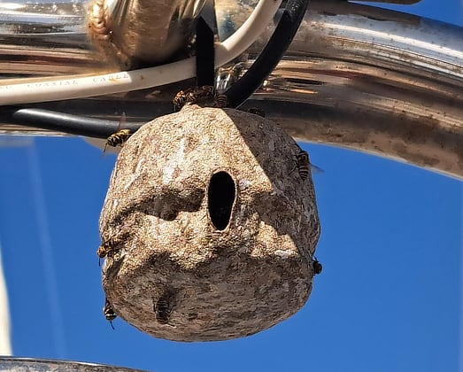 It was then time to take off all the covers – at which time we found a wasps nest attached to the stern arch….