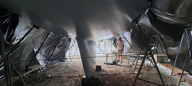 We had two major projects, the first being the replacement of our four saloon windows and repair to some water damaged wood and veneer in one corner and to have this work done we had to have a shrink-wrap tent erected over the top of the boat.