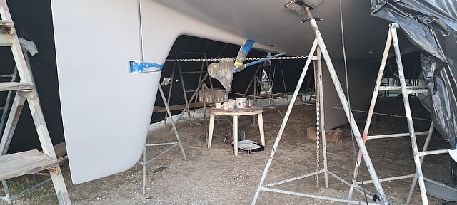 Whilst the tent over the boat keeps water off most of the deck and all the saloon windows, rain still runs down the topsides to the bottom, so to complete the antifouling a temporary shelter was taped to the sides….