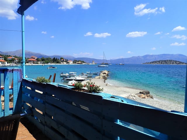 So, whilst Vliho may provide a secure anchorage it isn’t really the best place to entertain guests. We also had to work out how to get Dave and Mags to Kefalonia and so we took a dinghy ride up to Nidri to have a couple of drinks and some lunch and see if the “Nidri Star” [the ferry between Nidri and Fiskardo] was operating. It seemed as though it would be sailing on the weekend – 26/27 Sept – so we decided to hire a car to show them around the area for the next couple of days. Mike went to enquire about cost…. and basically came back with a car. “But you haven’t got your licence with you” I said. Seems as though the guy was so keen to get a sale that he didn’t care. He had probably had a bad summer with few rentals and was glad of the money…. and the car wasn’t exactly the most salubrious – but it did what we wanted so it was win/win.