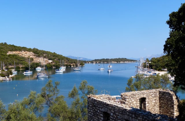Having stocked up, the first place we visited was the “Fortress of Agia Mavra” which lies at the north entrance to the Lefkada canal. We were rather disappointed that having paid the full price we were told, on entering the main courtyard, that much of the fort was out of bounds due to renovations and that, for whatever reason, we were not allowed to take photographs inside the fortress. Ever determined to find some photographic memento we found this view out of one of the fortress small gates.