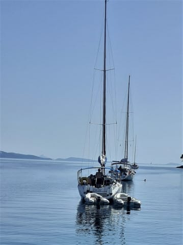 … and anchored back in Preveza at 17.40 having completed the 64nm journey. The second half of the trip was into wind and pretty big waves which slowed us down and made for a bit of an uncomfortable few hours, but we were on schedule to meet as arranged. We therefore couldn’t believe it when we received a message from Mags to say they were still in London as she had completed the PLF [Passenger Locator Form] incorrectly.